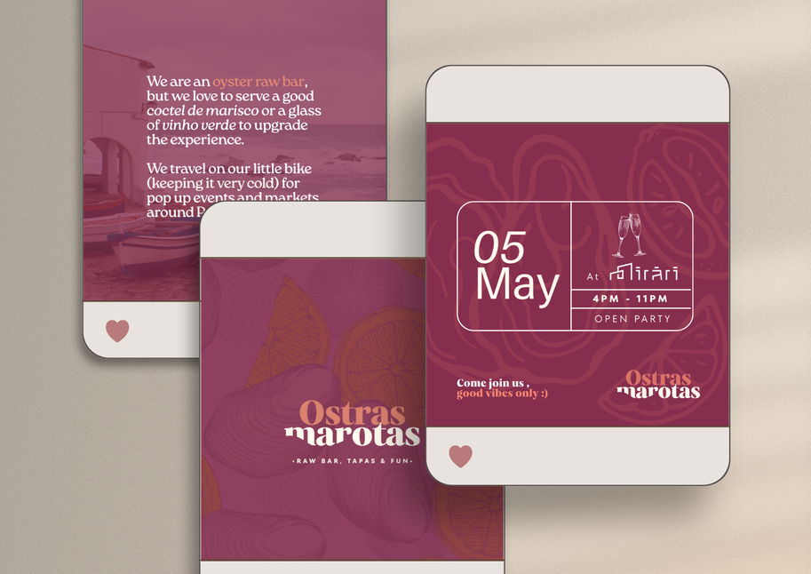 Developed the full branding for Ostras Marotas, a playful oyster and tapas concept that pops up in local markets and street food events. The visual identity is bold, fresh, and approachable — designed to reflect the brand’s lively spirit and Mediterranean soul.